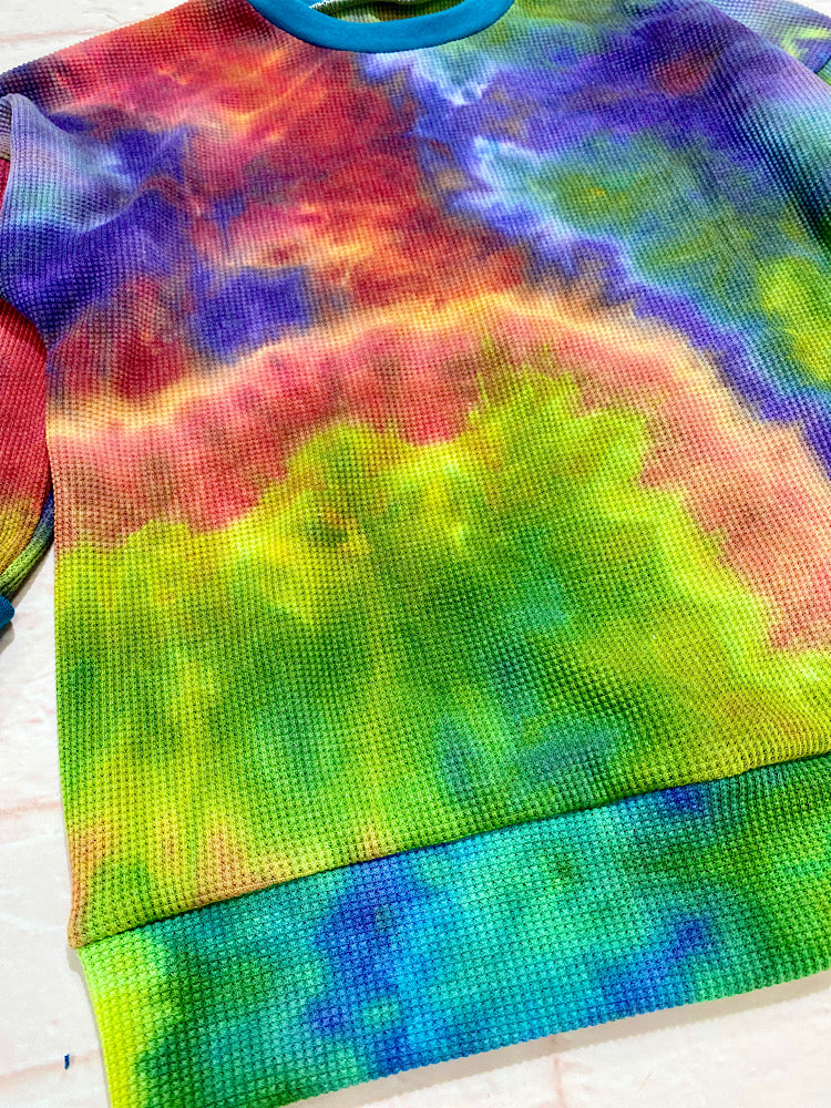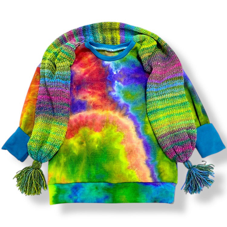 This winter set comprises of a beautiful handmade scarf and slouchy lounge pullover jumper, the jumper is made from stretch waffle knit fabric that has been ice dyed using premium DHARMA fiber reactive procion dyes.