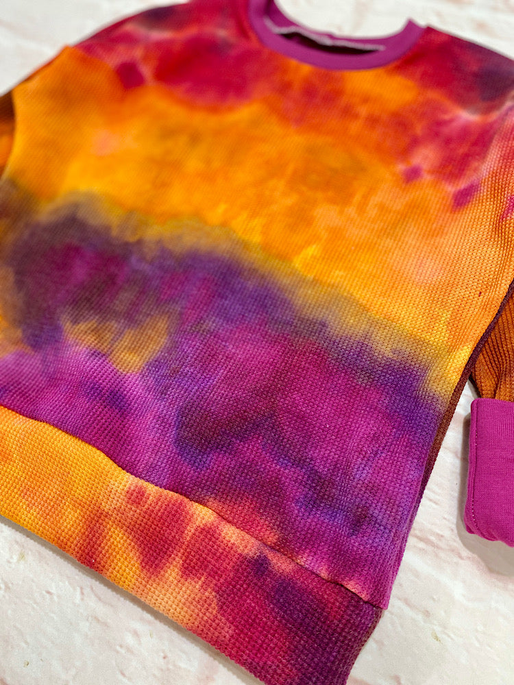 This winter set comprises of a beautiful handmade scarf and slouchy lounge pullover jumper, the jumper is made from stretch waffle knit fabric that has been ice dyed using premium DHARMA fiber reactive procion dyes.