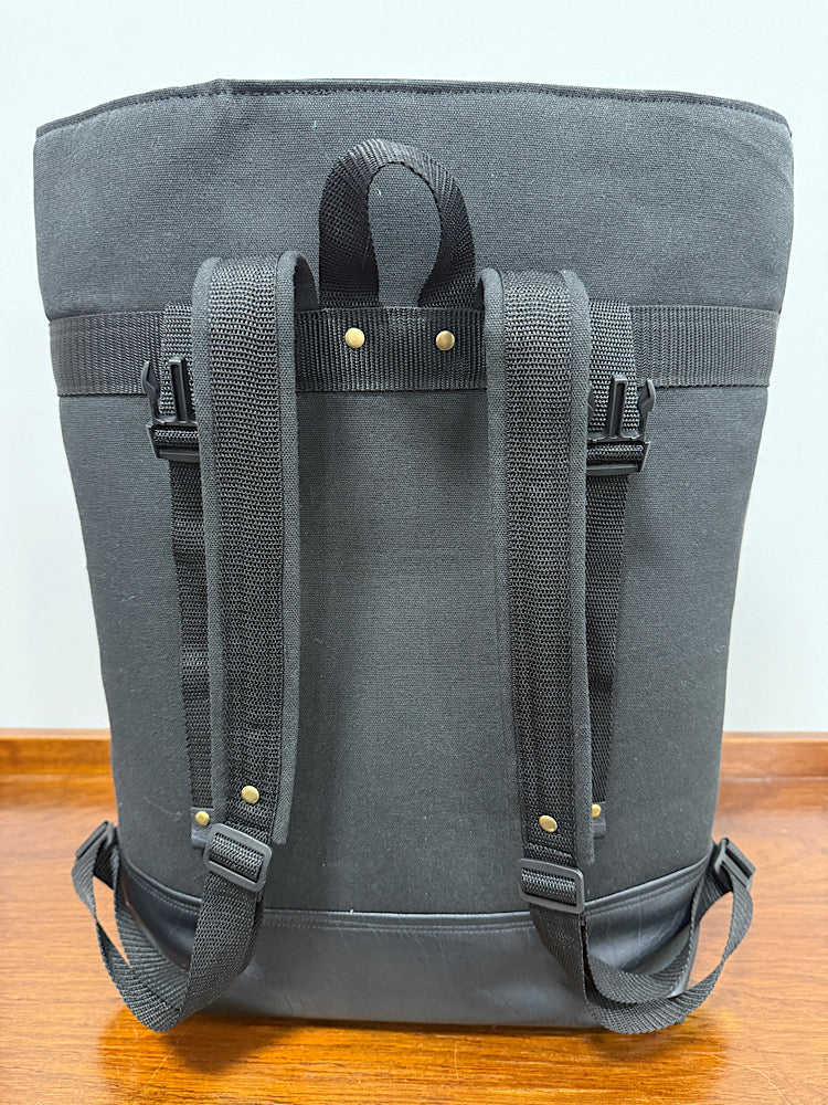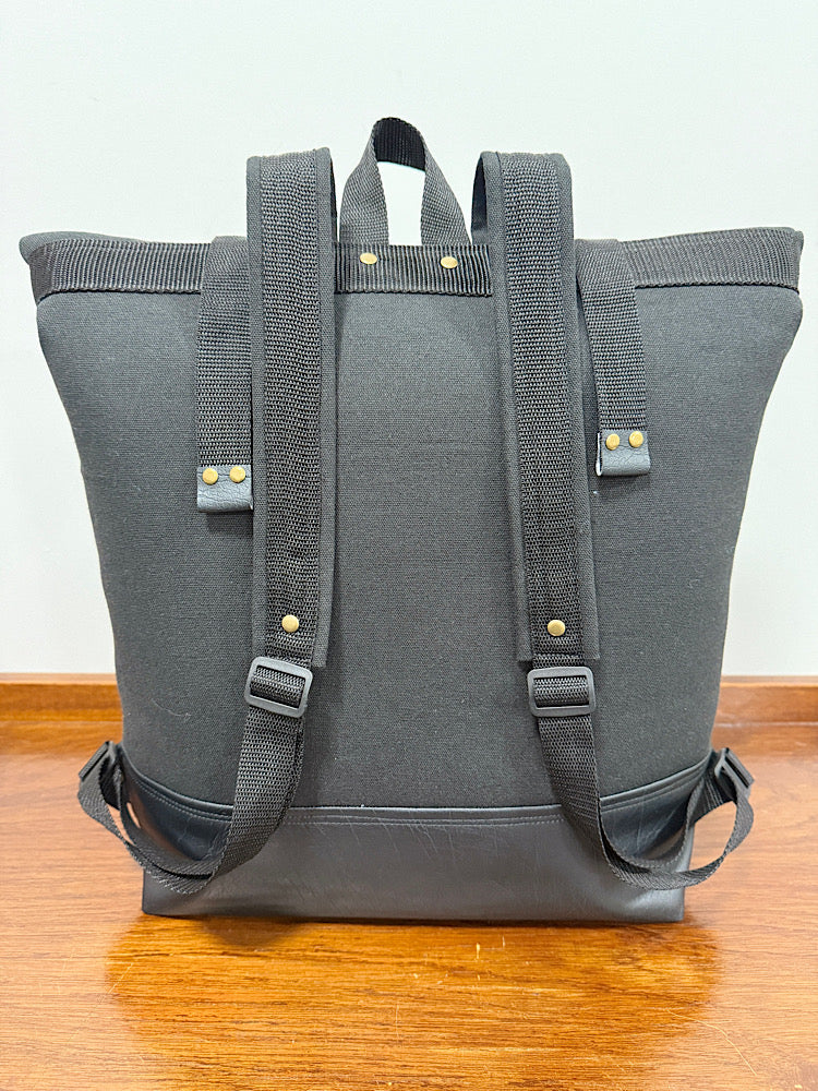 Beautifully handcrafted roll top backpack made from heavy duty canvas and vegan leather