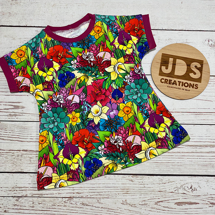 Choose your fabric design from the fabric galleries (found under the main menu at the top of the page), the tops can be made with any stretch knit OR stretch French terry fabric designs