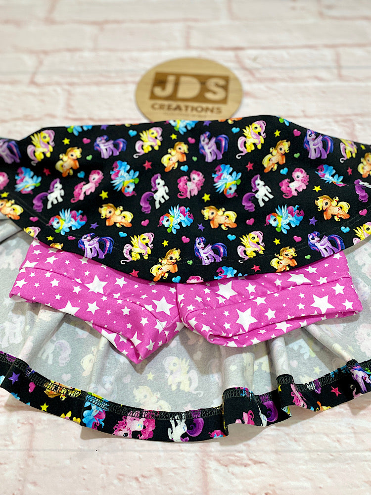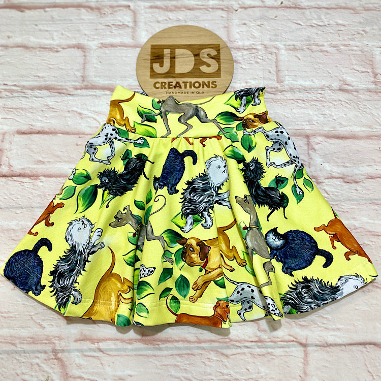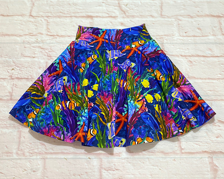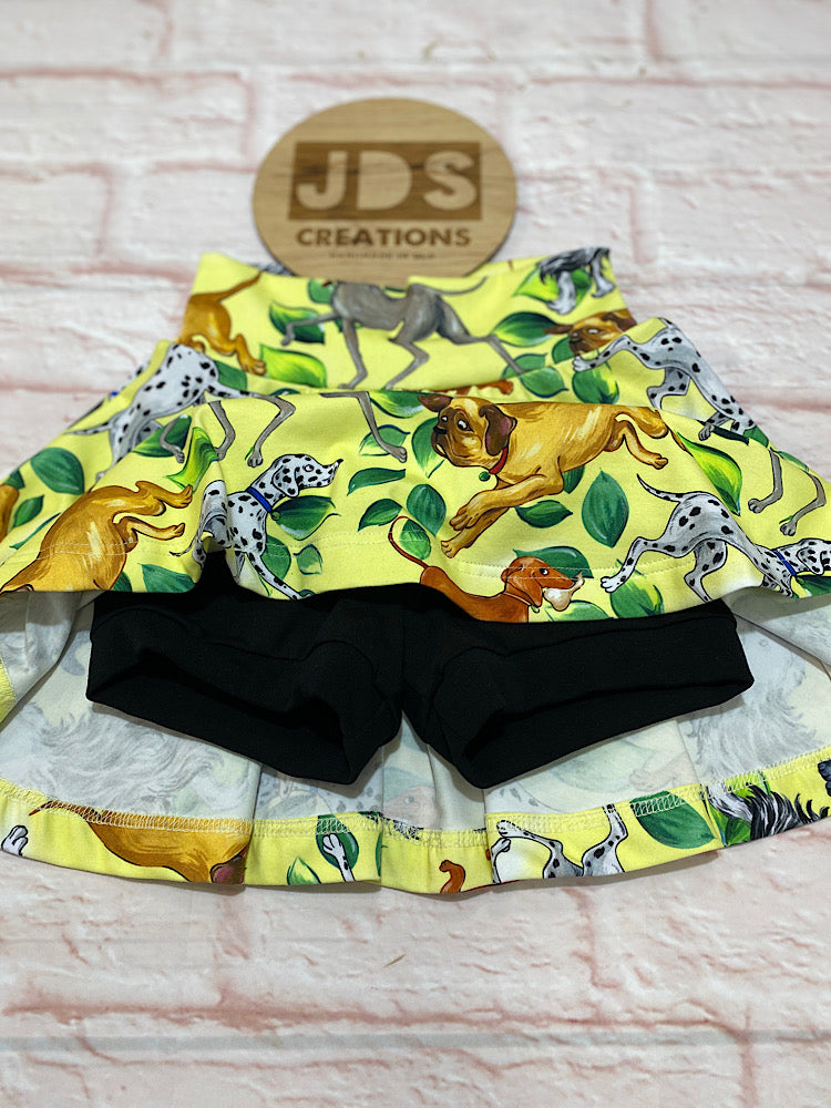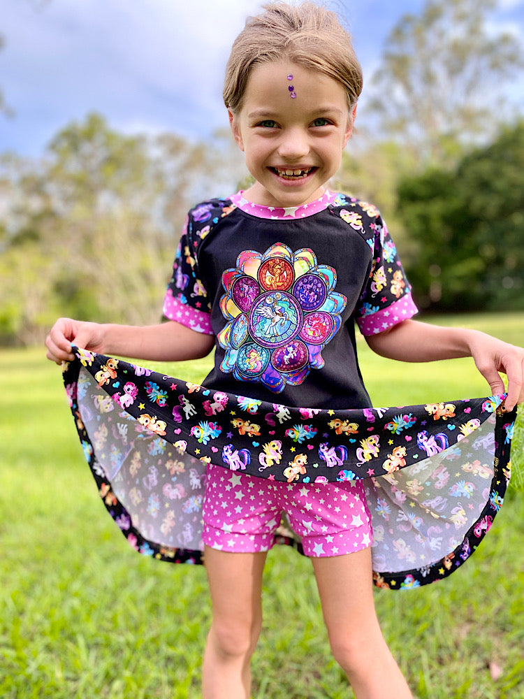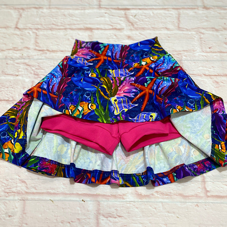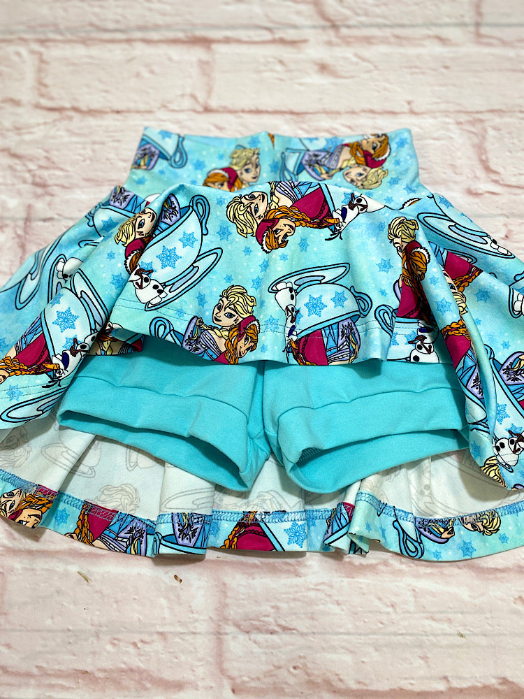 The skorts are a super twirly full circle skirt with a wide stretchy waistband, with inbuilt shorts. The skorts are a 'Grow with me' style designed to fit a size/age range. The skirt will be a longer fit on the smaller end of the size range and as your child grows the skirt will become shorter. This style of clothing is not only super comfy, it is economical since the item will fit your child for multiple years, and is also great if you have siblings of similar ages.