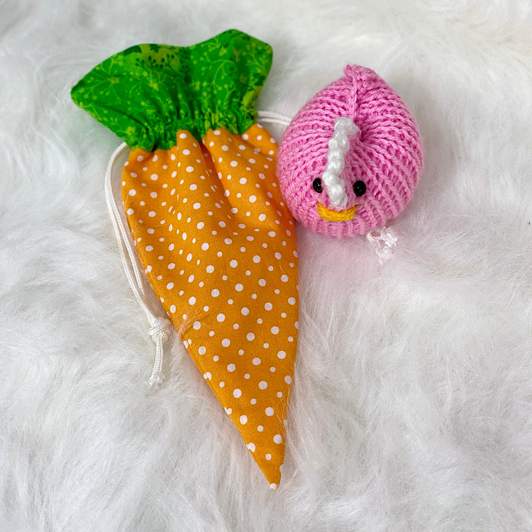 Super cute handmade knitted and crocheted baby chick in a lined carrot drawstring bag handmade from quality quilting cotton fabric