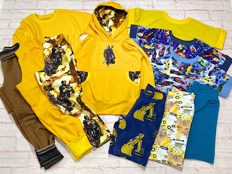The custom made mega capsule wardrobe is made in the Grow With Me (GWM) clothing style. The GWM style is designed to fit an age range, this unique GWM design will accommodate for the growth of your child with cuffs and bands that will extend as your child grows. The GWM clothing is designed to be a loose fit at the bottom end of the size range and will become more fitted at the top end of the size range.